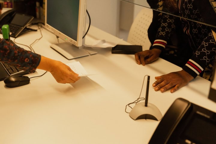 Terwijl de administeatief medewerkers hun administratie doen, nemen zij er de bezoekers tussen.