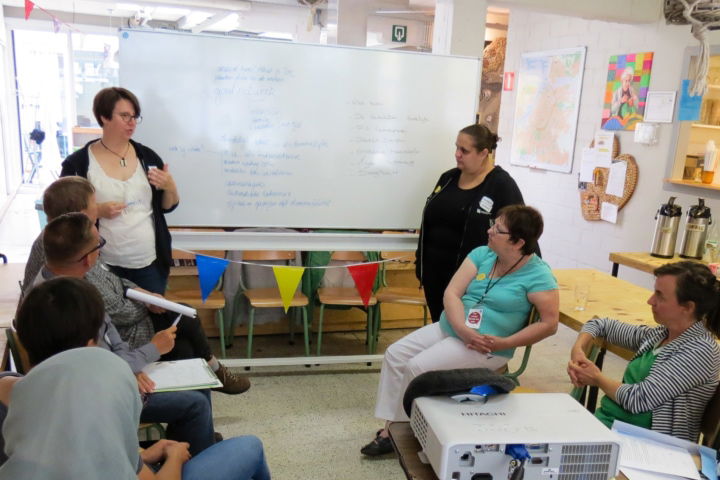 Leen Van den Bulck (links) met budgetgidsen tijdens een voorstelling voor lokale politici.