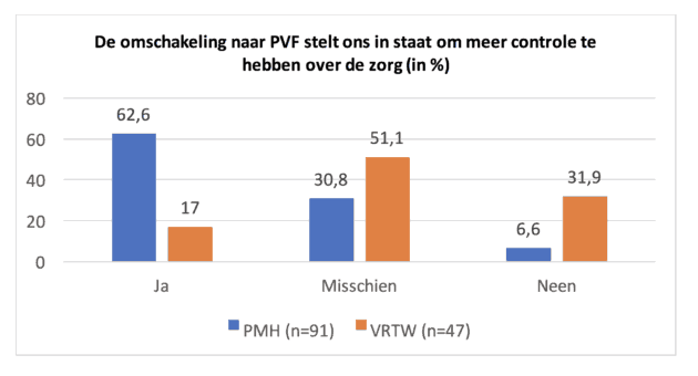 In dezelfde lijn verwacht 32% van de personen met handicap in de toekomst meer keuzes te kunnen maken, 13% van de vertegenwoordigers volgt die positieve kijk. In een scherper geformuleerde stelling komen de verschillen nog meer tot uiting. 63% van de personen met handicap bevestigen dat persoonsvolgende financiering hen meer controle geeft over de zorg, tegenover 17% van de vertegenwoordigers.