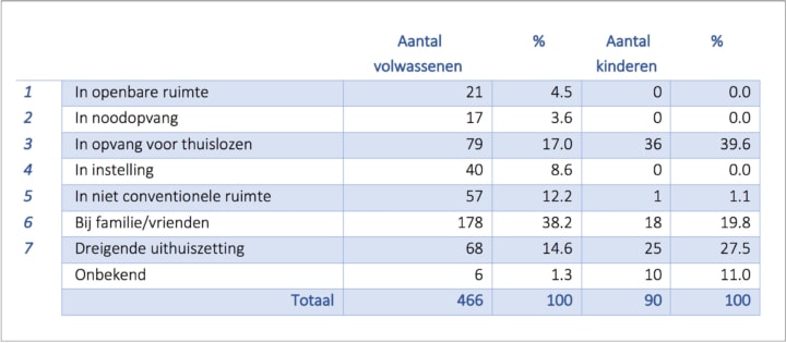 In totaal telden we 466 volwassenen in een precaire woonsituatie. 21 mensen slapen in de openbare ruimte, 17 mensen in de winteropvang. 79 mensen verblijven in opvangcentra of tijdelijke woonoplossingen zoals doorgangswoningen. 178 volwassenen wonen tijdelijk bij familie of vrienden. 40 personen moeten de maand volgend op de teldag een instelling verlaten zonder woonoplossing.