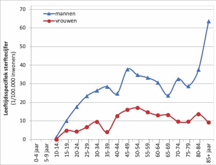 Studies tonen aan dat ouderen in vergelijking met andere leeftijdsgroepen bijzonder kwetsbaar zijn voor zelfmoord. Ook in Vlaanderen komt zelfmoord het meest voor bij ouderen van 75 jaar en ouder (zie figuur 1).Bovendien kunnen we uitgaan van een onderrapportering omdat waarschijnlijk niet alle suïcides bij ouderen opgemerkt worden als onnatuurlijke dood en dus niet als zelfmoord worden geregistreerd.Net als op (jong)volwassenleeftijd komt zelfmoord frequenter voor bij oudere mannen dan bij vrouwen.