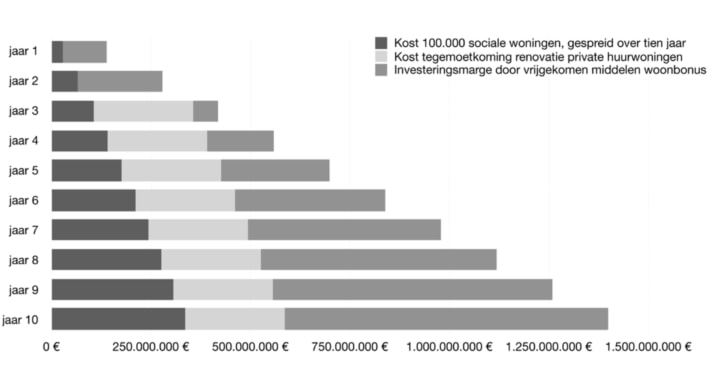 Extra investeringsruimte bij bouw 100.000 sociale woningen door afbouw woonbonus, gespreid over tien jaar.