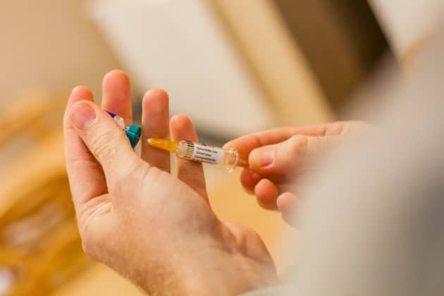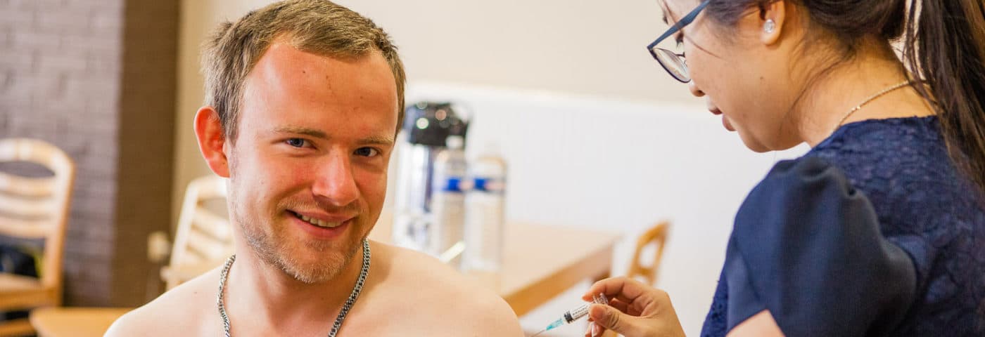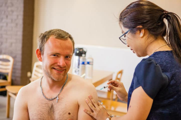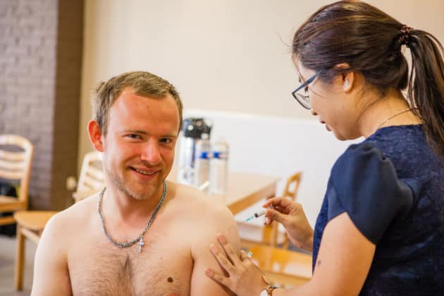 Na de registratie verhuizen de mensen naar de tafel ernaast voor hun injecties. Glenn heeft de spuiten al klaargelegd. Niemand ziet er bepaald vrolijk uit op het moment dat de naald in hun arm verdwijnt. Doet het pijn? “Nee hoor”, houdt een man zich sterk terwijl hij zuur lacht voor de foto. Op minder dan een minuut is het voorbij. Na afloop krijgt iedereen een ingevulde vaccinatiekaart.