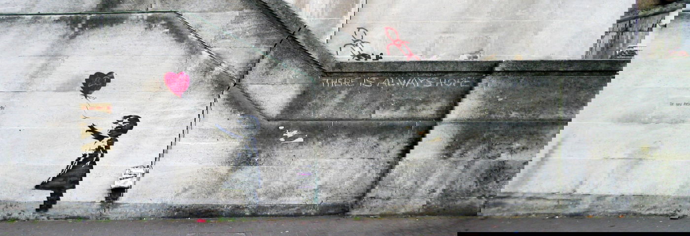 Zoals de Britse kunstenaar Banksy een onverschillig stukje kille muur omtovert in een boodschap van hoop door er een meisje met een hartenballon op te schilderen. Op zich geen groots gebaar, ware het niet dat het beeld sindsdien de wereld rondgaat. Zo uit Banksy een aanklacht tegen onrecht, wat hij herhaalt in het huilend meisje op de deur van de Parijse Bataclan, of de relschopper die bloemen gooit in de plaats van een molotovcocktail.